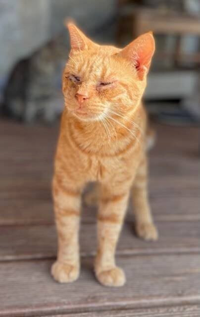 Jerry is the sweetest cat you can imagine, he is so soft natured and not a nasty bone in his body. He was at the dog shelter in AntiParos where he saw the vet and needed a lot of teeth extracting. Where he had struggled to eat he was quiet a bit underweight so I took him home to help his recovery. After a while we noticed his eyes would just never clear up. I took him to the vets where they said his eyelashes were growing in towards his eye and scratching and damaging the cornea, this is called Entropion. He went through an operation to fix the problem which worked for a long time but then it happened again. He had the same procedure and they seem ok but now you can see his eyes are clouded from damage and still need cleaning and eye drops from time to time.